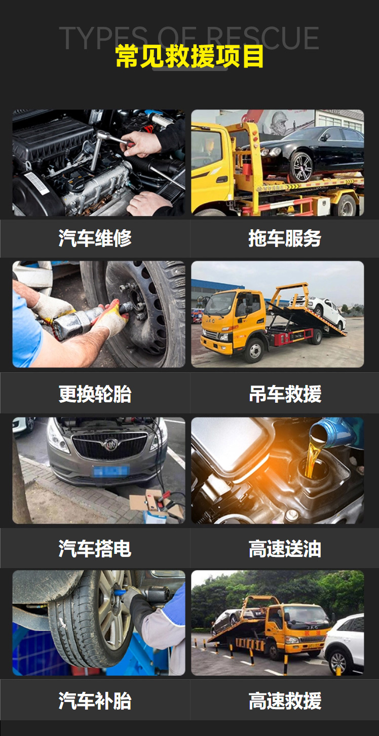 1. 车辆故障拖车:针对因发动机故障、电路问题或机械故障导致无法启动的车辆,提供现场拖车服务。